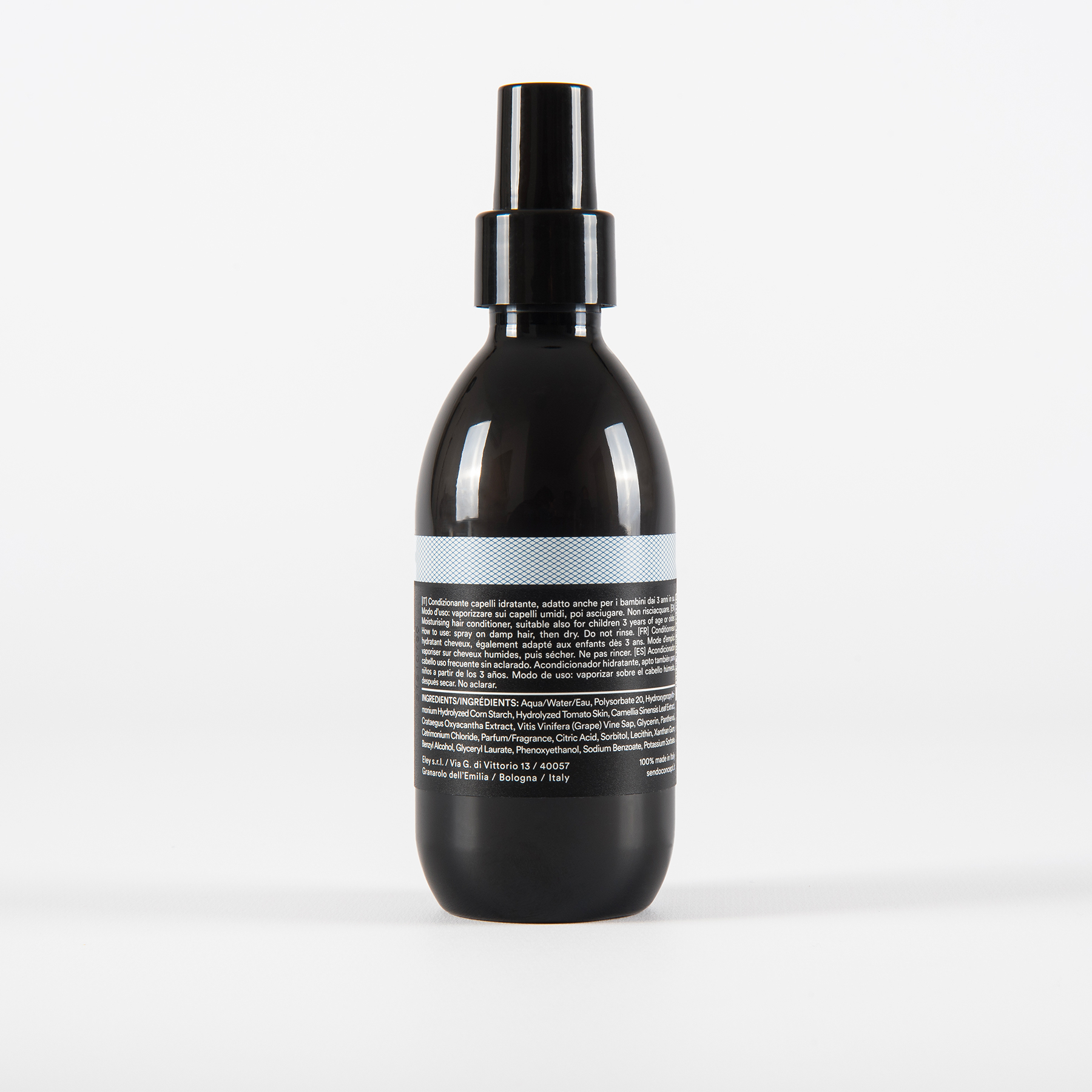 INCI: Aqua/Water/Eau, Polysorbate 20, Hydroxypropyltri- monium Hydrolyzed Corn Starch, Hydrolyzed Tomato Skin, Camellia Sinensis Leaf Extract, Crataegus Oxyacantha Extract, Vitis Vinifera (Grape) Vine Sap, Glycerin, Panthenol, Cetrimonium Chloride, Parfum/Fragrance, Citric Acid, Sorbitol, Lecithin, Xanthan Gum, Benzyl Alcohol, Glyceryl Laurate, Phenoxyethanol, Sodium Benzoate, Potassium Sorbate.